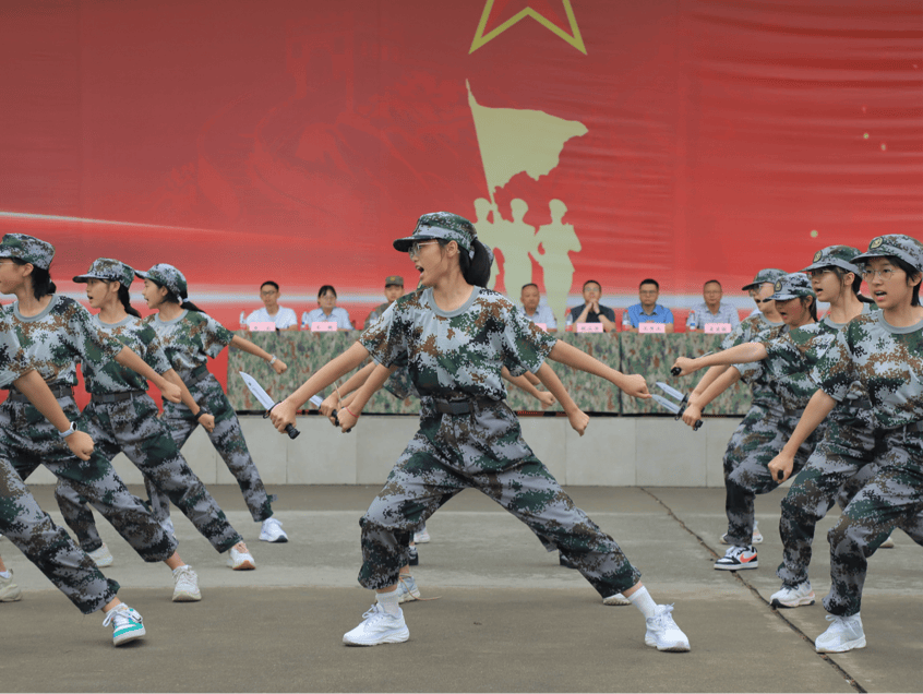 最引人瞩目的军训汇报表演。21个班级化身特色方阵,队列展示、匕首操、军体拳、手语操等依次登场,演绎青春的多面风采。队列展示中,各方阵步伐铿锵、排面整齐,转体、看齐动作干脆利落,尽显严明的纪律与昂扬的风貌;匕首操方阵动作利落如风,寒光映着少年眉眼,尽显飒爽英气;军体拳方阵拳风刚劲似雷,每一招一式都凝结着一周训练的汗水与坚持,将不服输的韧劲融入拳脚;手语操方阵则以柔克刚,指尖起落间满是坚定,把青春朝气与责任担当谱成动人乐章。同学们步伐铿锵、精神抖擞,眼中的坚毅藏不住成长的蜕变,精彩表现赢得阵阵掌声,每一声喝彩都是对少年蜕变的由衷赞许。